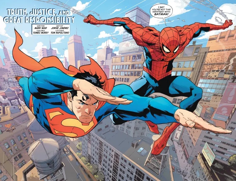 Sumada a un Waid perfecto, tenemos a otra de las super estrellas de la DC actual, el dibujante español Jorge Jiménez. De Jiménez ya tenía claro que es un artista todoterreno capaz de dibujar cualquier cosa. Tras leer este especial, sigo pensando que Batman se ajusta más a sus puntos fuertes, pero lo cierto es que ha dibujado a unos Superman y Spider-Man super canónicos que han sido una delicia. Su Peter Parker y su Clark Kent son atemporales y perfectos, y cuando llega el momento de la acción, todo está contado de forma increíble.