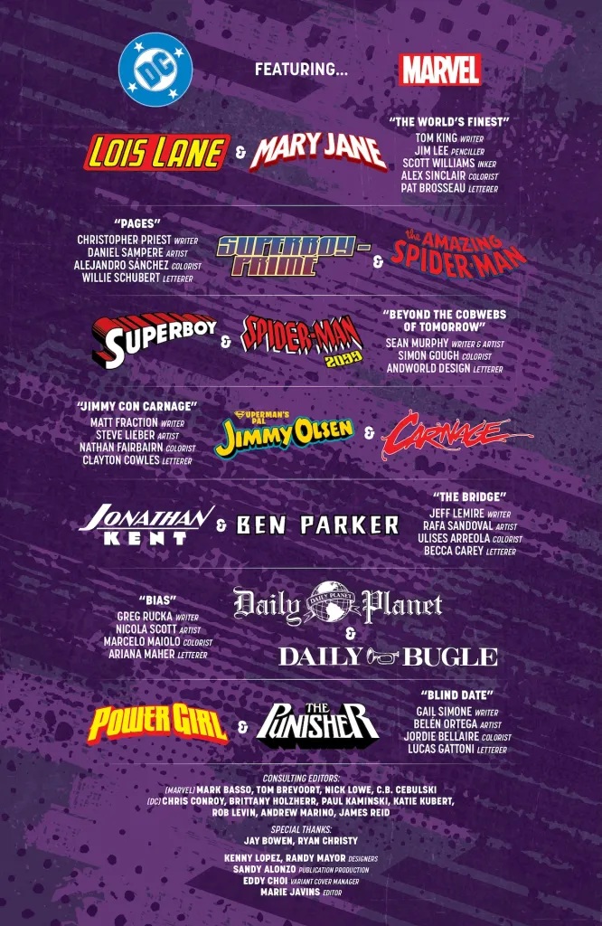 Y no te pierdas estas historias extra: Tom King y Jim Lee nos cuentan una historia sobre Lois Lane y Mary Jane Watson. Matt Fraction y Steve Lieber vuelven a visitar al amigo de Superman, Jimmy Olsen… ¡y a Carnage! Por su parte, Sean Murphy nos lleva al futuro con Superboy (Legion) y Spider-Man 2099. Gail Simone se une a Belén Ortega para mostrarnos qué pasa cuando Power Girl se encuentra con Punisher. Christopher Priest y Daniel Sampere nos muestran un momento en el que Superboy Prime (que lee todos los cómics) decidió visitar a Spider-Man justo después de que este consiguiera el traje negro. Greg Rucka y Nicola Scott nos llevan a una emocionante carrera: entre el Daily Planet y el Daily Bugle. Además, ¡por fin podemos responder a la eterna pregunta de quién ganaría en una pelea justa, Pa Kent o el tío Ben! Es broma, esos tipos son demasiado buenos para pelearse entre ellos, pero Jeff Lemire y Rafa Sandoval nos llevarán a lo más profundo del pasado para ver cómo los dos hombres forjan un vínculo frente a la adversidad. ¡Celebra los 50 años de crossovers entre DC y Marvel con ocho nuevas historias originales de algunos de los mejores talentos de DC!