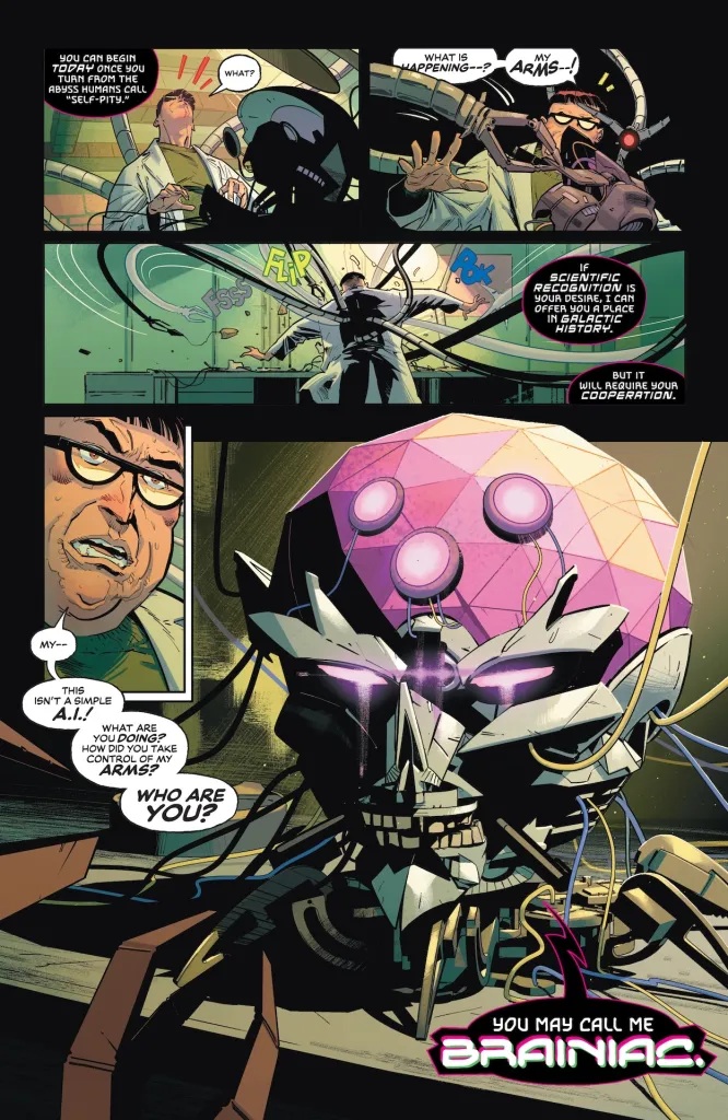 Lo mejor sin duda de este especial es la historia principal del comic, obra de Mark Waid, Jorge Jiménez y Tomeu Morey en el color. Esta historia de 24 páginas enfrenta a nuestros héroes contra el Doctor Octopus y Brainiac, y es una delicia de principio a fin porque se nota que Waid es un gran conocedor de ambos personajes. Las situaciones que plantea unido a unos diálogos perfectos nos muestran al Waid mega-estrella que sabe condensar la esencia de los personajes con dos líneas de diálogo. Además, acostumbrado como estoy a leer su World´s Finest, ya tenía claro que la limitación de páginas no iba a ser un problema, cuando con 20 páginas va sobrado en lo que a entretenimiento se refiere.