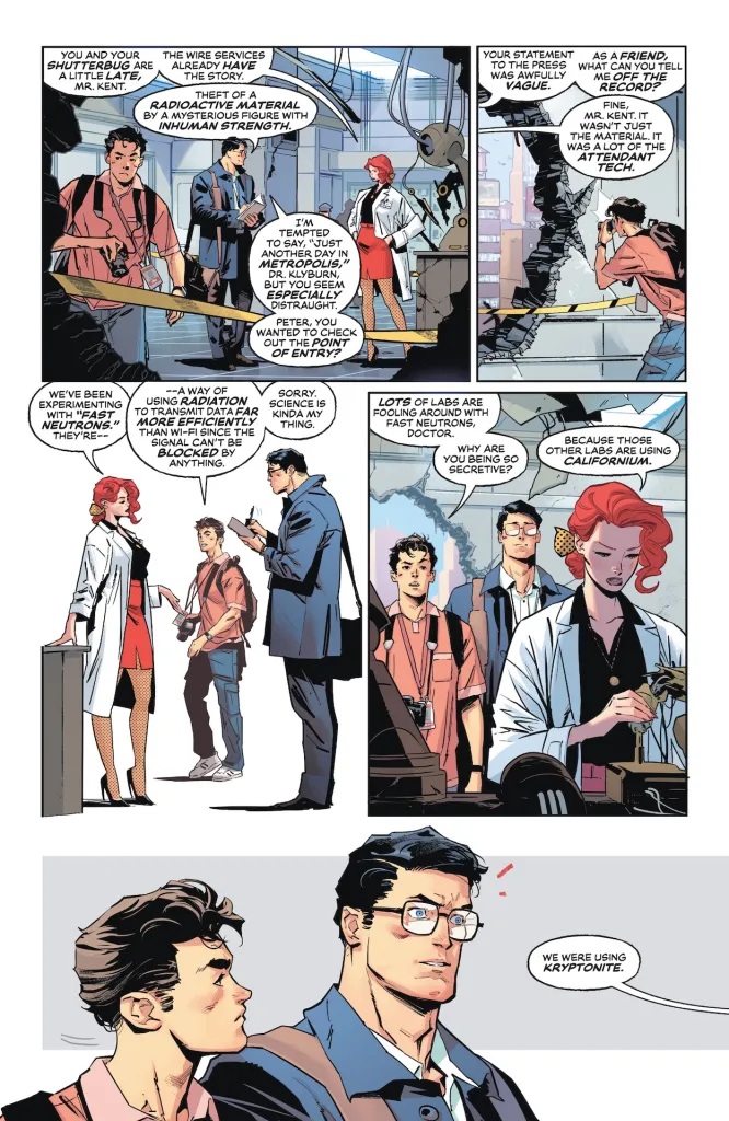 Tom King no está nada entonado en el cruce de Lois Lane con Mary Jane, que es una chorrada de historia que parece planteada para mostrarnos como las novias de los héroes son más parecidas de lo que ellas creen. Lo malo es que es algo que no se sostiene. Empezando con que Mary Jane ahora mismo ni siquiera es pareja de Peter. Por su parte, Jim Lee (con entintado de Scott Williams y color de Alex Sinclair) parece que estaba más interesado en colar un pin-up molón de Gambit que en dibujar la historia que tenía entre manos con el Hombre de Acero, el Trepamuros y sus parejas. Y la verdad es que esa doble splash-page mola y nos devuelve al mejor Lee de hace 30 años. Teniendo en cuenta que estamos ante 9 páginas de historia teóricamente de Superman y Spidey con Lois y MJ, es una oportunidad totalmente desaprovechada