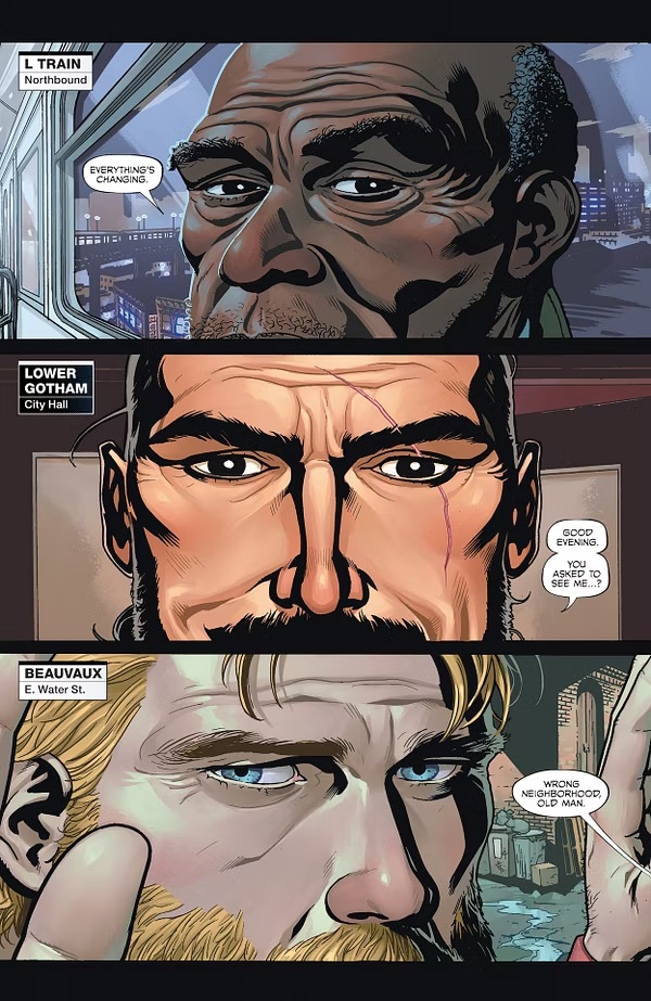 En este ecosistema complejo se desarrolla este número dividido en tres historias con tres protagonistas que ninguno es Batman. Y lo primero que hay que agradecer es que Matt Fraction realmente está intentando hacer cosas diferentes en cada grapa, consiguiendo que no parezca algo mil veces visto. Hablando de un comic de Batman, personaje del que se publican cada mes montones de historias, esto ya es un éxito en si mismo. Dentro de la narrativa a tres, la grapa sigue ofreciendo una lectura que resulta autocontenida y satisfactoria en si misma.