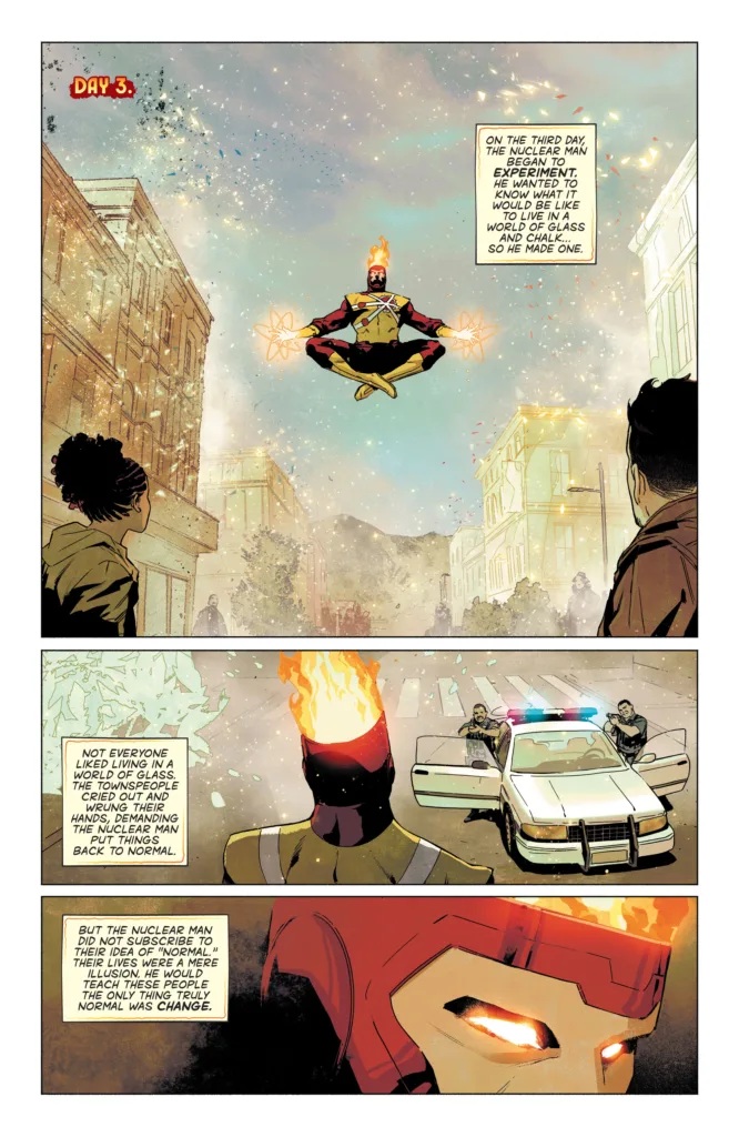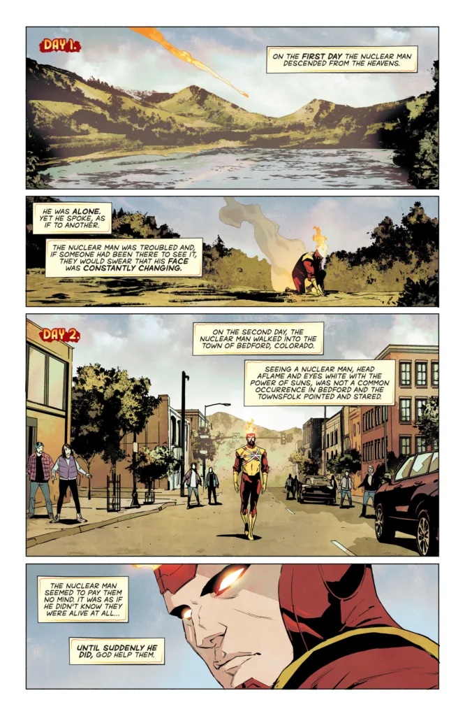 La localidad de Bedford, en Colorado, es un tranquilo pueblecito. La gente saluda a sus vecinos, asiste a las reuniones del ayuntamiento y anima al equipo de fútbol americano del instituto local los viernes por la noche. Pero esta idílica localidad se ve sacudida de tal manera cuando llega el Hombre Nuclear y empieza a… experimentar. Firestorm ha convertido edificios en arena y a las personas en cristal sin remordimientos y sin previo aviso. Pero, ¿qué fue exactamente lo que llevó a Ronnie Raymond a cometer este acto atroz? ¿Y puede alguien contener la furia de Firestorm?