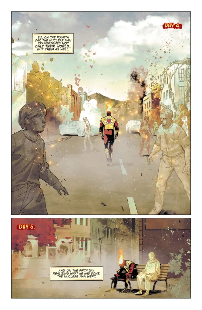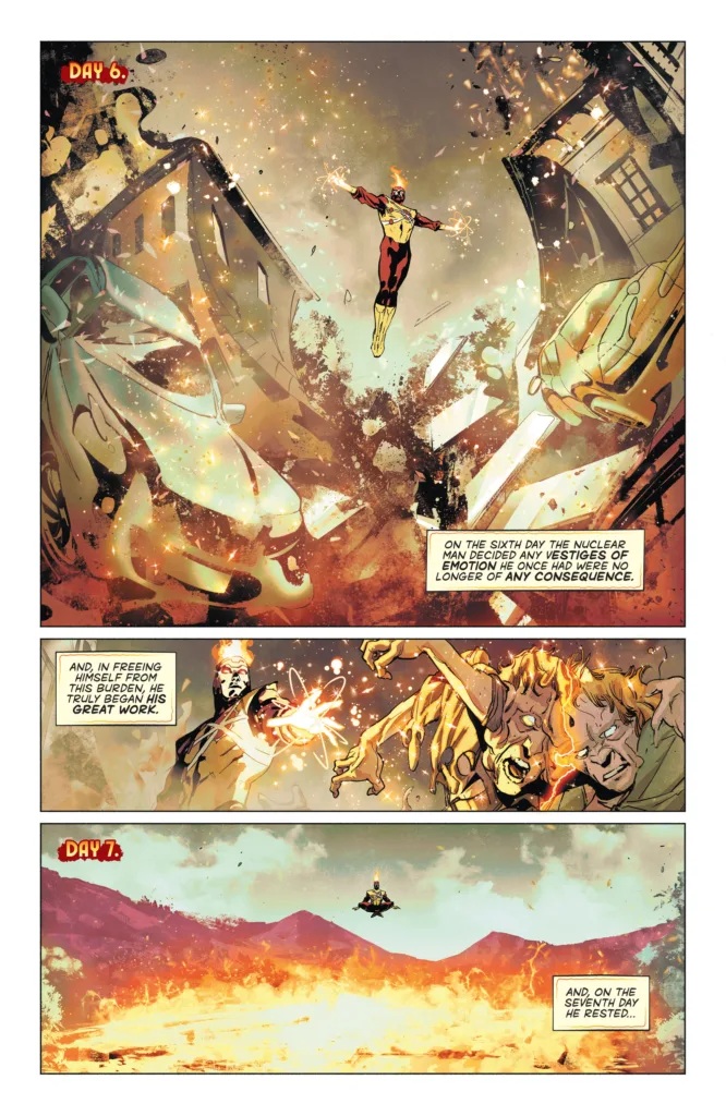 Una parte muy importante del éxito de este comic ha sido el dibujo de Rafael de Latorre y el color de Marcelo Maiolo. De Latorre muestra a un Firestorm inhumanamente aterrador, planteando una amenaza que puede destruir el planeta si no es detenido a tiempo. Me gusta además como cambia su estilo en las páginas de Ronnie, haciendo que parezcan un comic de DC de los 80, lo que ayuda a crear capas de misterio sobre su paradero y por qué ha perdido el control. La narrativa de Latorre me parece perfecta y consigue que el comic sea una delicia de leer y enganche desde la primera página.