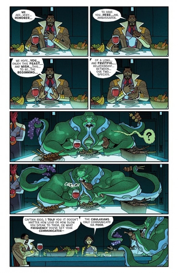 Layman plantea este comic como historias autoconclusivas dentro de una historia mayor planteada a modo de una primera temporada, y ofrece en cada entrega detalles chulísimos mientras pervierte las convenciones del género de la ciencia ficción espacial.