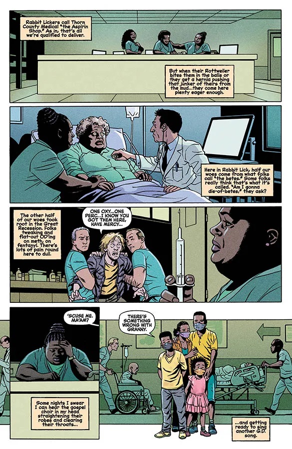 Ambientar esta historia en el mundo de los áreas de descanso de los camioneros en mitad de la nada de los Estados Unidos permite presentar una historia macabra con un feel diferente dentro de estar en el ámbito rural, foco inagotable de asesinos y víctimas sin opción de ser ayudadas por nadie. En este sentido, siempre he sentido que el comic tiene las de perder en este tipo de historias frente a cine o televisión al no poder apoyarse en la música o la edición de sonido para crear tensión o los jump-scares, teniendo tan sólo la sorpresa y el impacto del giro de la página. Sin embargo, en el caso de Devil´s Highway creo que Benjamin Percy hace un trabajo estupendo en la creación de una historia que consigue enganchar desde le primera escena.