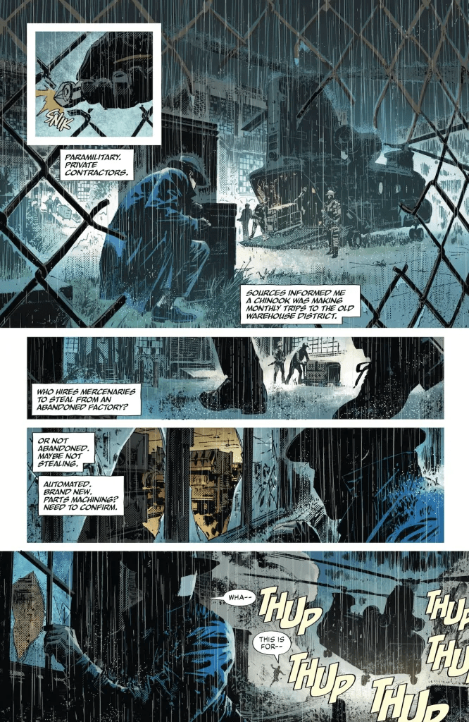 Empezando con la historia, el primer elemento destacable es que Waid y Samnee evitan utilizar a muchos villanos clásicos como Joker, etc… presentando un nuevo villano el General Anthony Grimaldi, un exmilitar que planea apoderarse de Gotham City. A medida que avance la historia veremos a Clayface (Matt Hagen) y a Dos Caras, pero yo agradecí muchísimo que no sea la típica historia clónica de decenas otras que ya hemos leído previamente. Dentro que el comic me parece excepcional, obviamente no podía plantear nada que rompiera con cientos de comics previos que son canon de los personajes, por lo resulta lógico y casi hasta obligatoria la vuelta al status-quo del universo DC.