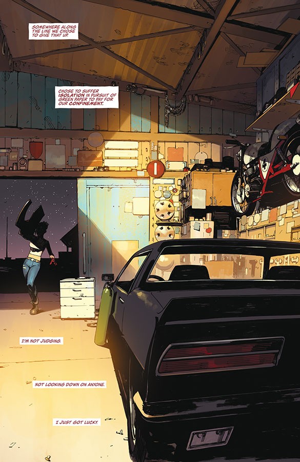 ¡Fua, chaval!!! Rick Remender me ha volado la cabeza con Napalm Lullaby. La premisa empieza como muchos comics e historias distópicas, con un mundo dominado por el mal, un mal nacido a partir de una secta religiosa, que acumula toda la riqueza mientras la gente normal sobrevive como puede entre los desechos de los ricos. Los primeros números recuerdan en muchos sentidos a montones de comics y películas o libros. Desde Akira, Elysium o Alita: Angel de combate, entre otros.