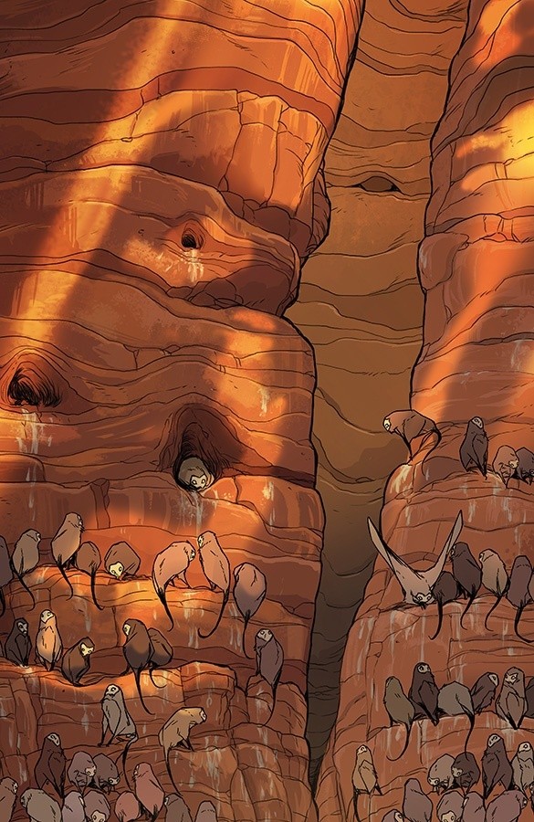 Gran parte del éxito de Isola está en el fantástico dibujo de Karl Kerschl y los colores de MSassyK. Con una narrativa fantástica y un diseño de personajes chulísimo, es comic está igual de preocupado en el worldbuilding como en transmitir los sentimientos de los protagonistas, incluso de la tigresa. El color de MSassyK utiliza una paleta que ayuda a resalta los estados anímicos de los personajes y a establecer los diferentes espacios o incluso para resaltar si estamos de día o de noche, lo que me parece otro acierto que ayuda a que el comic luzca bellísimo sin importar qué página estés mirando.