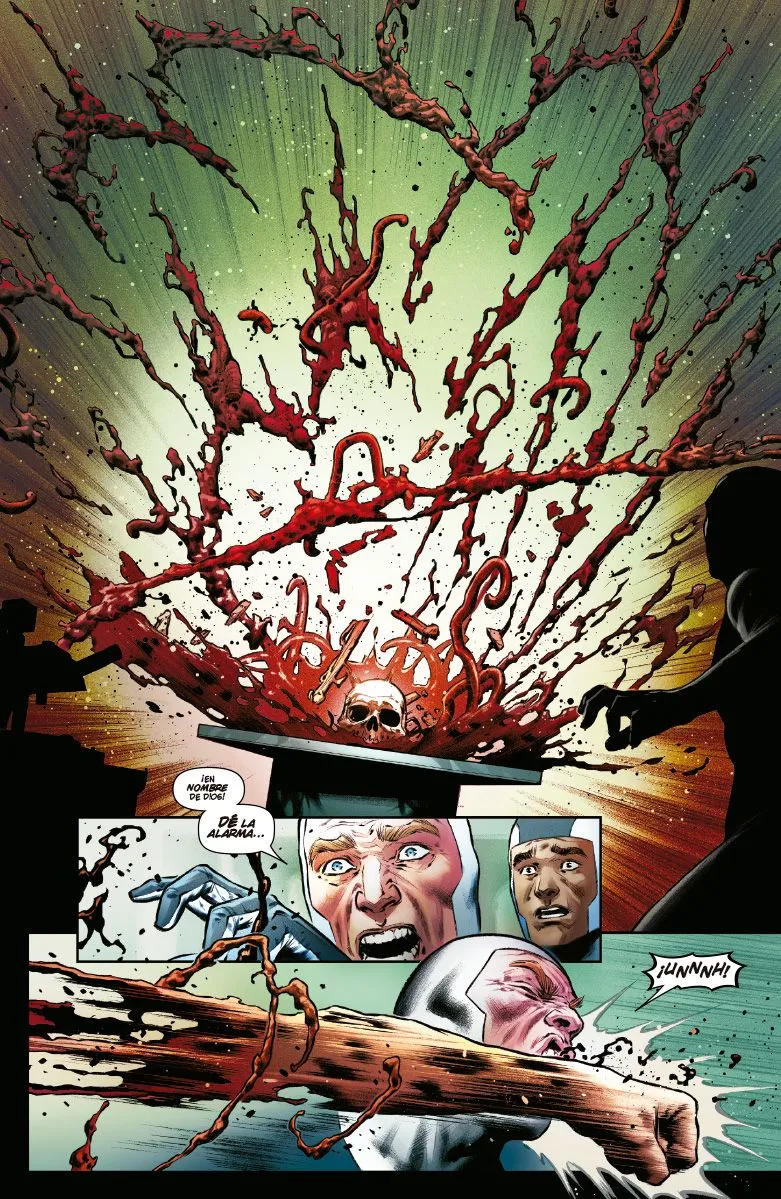 Este cruce de dos números se beneficia enormemente del dibujo del argentino Juan Ferreyra, que realiza tanto lápices como color. Ferreyra es un artista estupendo y consigue transmitir una atmósfera terrorífica que le funciona de maravilla al comic. No sólo la atmósfera, hay algunas imágenes tremendas, como la primera splash-page donde vemos el cuerpo de Lee Price, un antiguo huésped de Veneno que llevaba décadas muerto y enterrado. En lo relativo al dibujo de Ferreyra, creo que hace bueno el guion de Ewing.