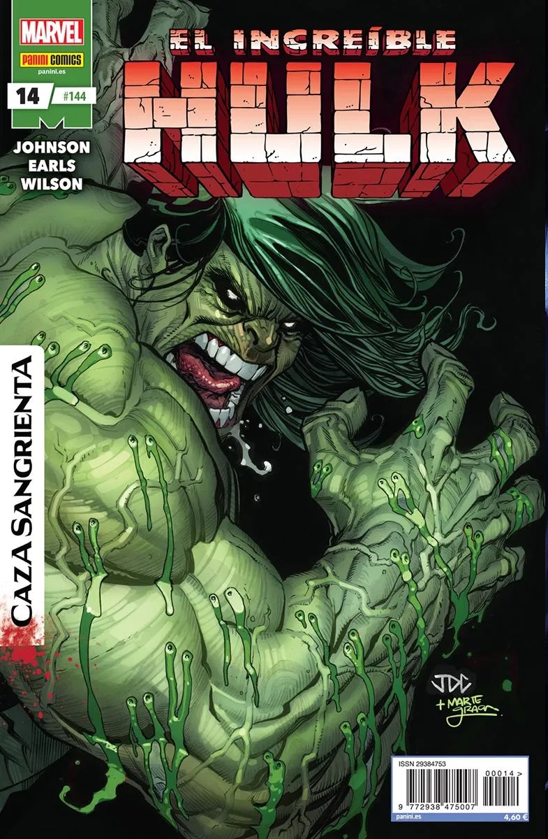 La miniserie principal de Caza Sangrienta de Jed MacKay y Pepe Larraz me ha flipado. Pero en los tie-ins de Caza Sangrienta nos han traído decepciones y aciertos. En especial el terrible C.F. Villa en Los Vengadores, que es un comic de vergüenza ajena. Al que hay que sumar en el debe a un Danny Earls que no me gusta tampoco. En positivo, Juan Ferreyra en Veneno y Juan José Ryp en Lobezno me han gustado en sus historias. Y en el caso de este Hulk, es una pena el dibujo, porque hubiera podido ser un comic estupendo y se queda en aprobado por los pelos.
