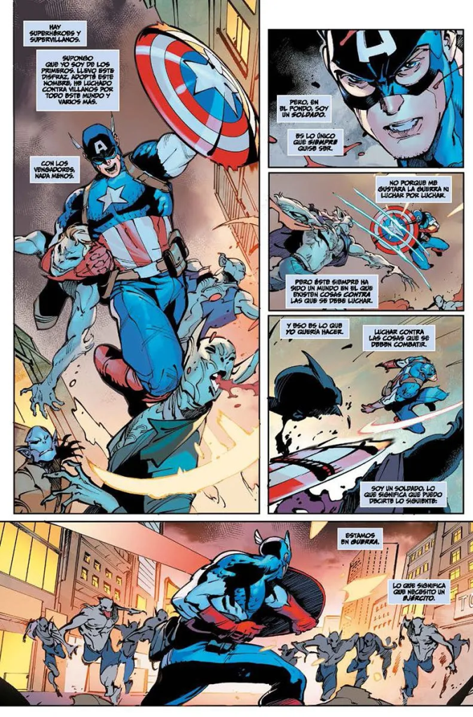 El desastre de dibujo de Villa no me ha dejado disfrutar de estos números. Y es una pena, porque la historia de Jed Mackay me parecía que cumplía perfectamente con lo que se espera de un tie-in de un evento de estas características. Como siempre, MacKay no inventa nada, al plantear que mientras los miembros actuales de Los Vengadores se enfrentan a los líderes de la invasión de vampiros, el Capitán América tiene que reunir una alineación nada habitual de héroes para enfrentarse a un grupo de Vampiros con unos planes malvados.