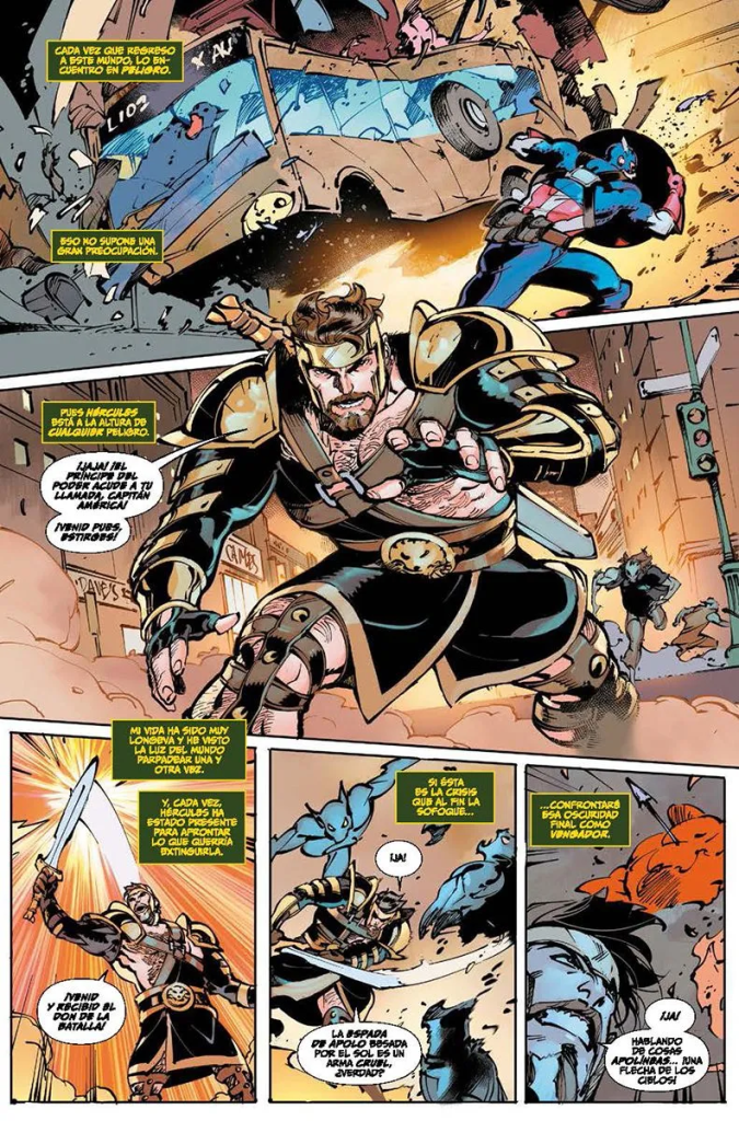 Junto a Capitán América encontramos una alineación formada por Mercurio, Ojo de Halcón (Kate Bishop), Hércules y Tóxica. Y una de las mejores cosas de este arco es la forma en que plantea una página del primer número desde el punto de vista de estos héroes, de forma que puedes conocerles un poquito y empatizar con ellos. Es cierto que MacKay no inventa nada, pero las herramientas narrativas a su disposición las utiliza de forma modélica. De hecho, pensando en que los vampiros en realidad son unos villanos de usar y tirar, MacKay acierta al mostrarnos que el líder de este grupo sea el Barón Sangre, un clásico villano de Capitán América que plantea un aceptable nivel de amenaza para nuestros héroes.