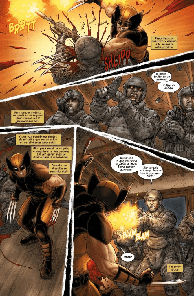 Este comic es ante todo una historia de acción repleta de sangre y ultraviolencia, al no cortarse a la hora de destruir a los vampiros de todo tipo que los protagonistas se irán encontrando. Como decía antes, el plan de Rebelde primero y de Alyssa después en realidad es absurdo, pero ofrece montones de situaciones violentas para que Juan José Ryp se luzca. Y la verdad es que el artista nacido en Algeciras lo aprovecha para lucirse. El otro día me lamentaba de haber comprado los comics de Los Vengadores dibujados por C.F. Villa, que me parece que son lamentables por culpa del dibujo. Por contra, Ryp al igual que Pepe Larraz son dibujantes que hacen mejor la historia que se les ofrece, creando coreografías salvajes y momentazos de ¡HELL, YEAH!!! en cada una de las cuatro grapas que componen esa miniserie. De hecho, este Lobezno: Caza Sangrienta entraría en la categoría de «comic comprable y disfrutable sólo por el dibujo»