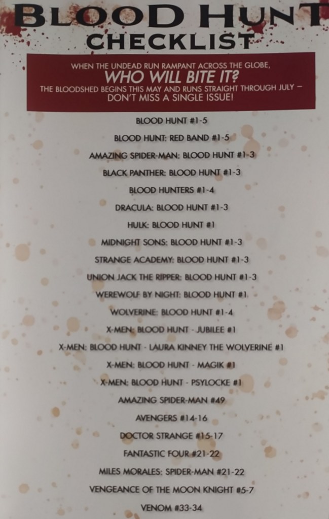 Siguiendo con los tie-ins, comentaba que no los he leído todos porque la crisis de ventas en España ha llevado a Panini a decidir que un montón de especiales vayan a quedar inéditos. Por ejemplo, los especiales X-Men: Blood Hunt dedicados a Magik, Psilocke, Jubilee y Laura Kinney The Wolverine y Werewolf by night, y las miniseries de Black Panther, Drácula, Strange Academy y Blood Hunter. Y por lo que decía antes, tengo claro que son comics de calidad cuestionable realizados por equipos creativos de segundo nivel que no van a aportar gran cosa al evento, lo que indica el nivel de sacacuartos que Marvel sigue planteando en USA.