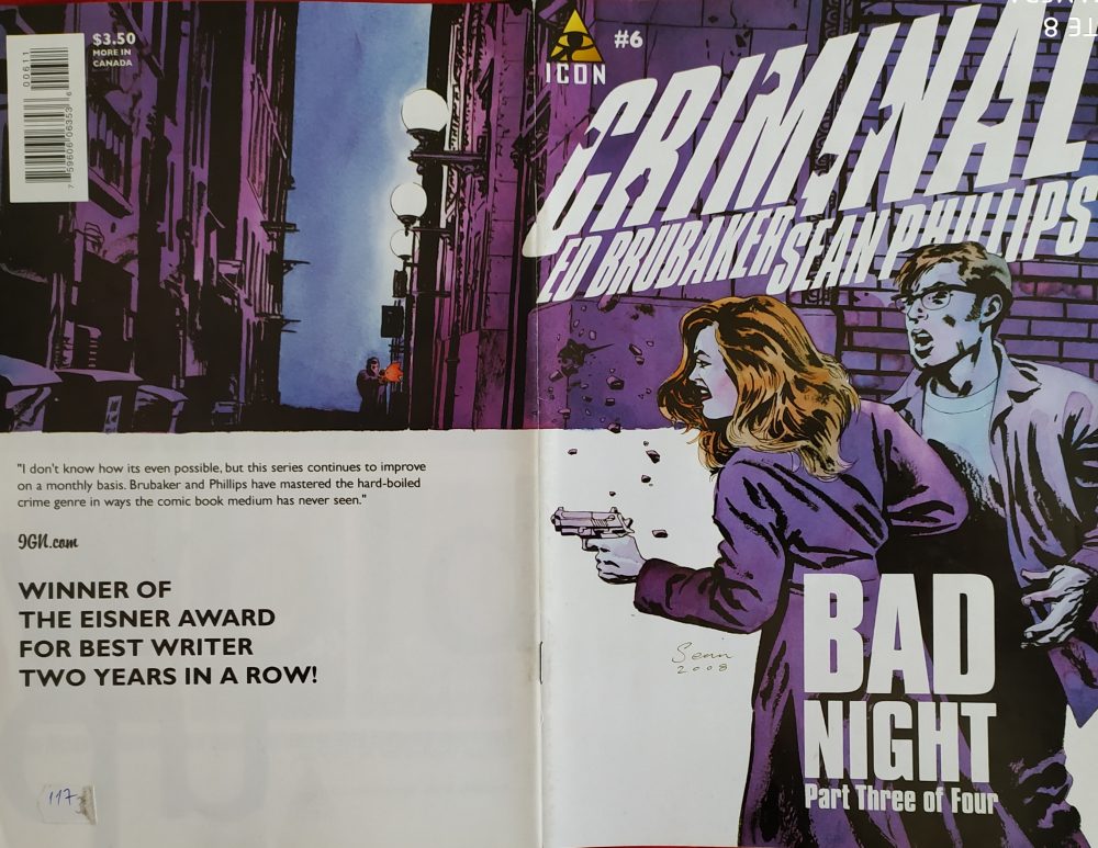 Bad Night es la historia más extraña hasta ahora en la serie Criminal, ya que un dibujante insomne queda atrapado en una historia sinuosa de autodestrucción, sexo y engaños mortales. Aquí es donde Brubaker y Phillips mostraron hasta dónde podían sobrepasar los límites entre el arte, la experimentación y el pulp. Después de convertirse en el principal sospechoso de un crimen horrible, Jacob Kurtz se encuentra vagando por las calles de la ciudad por la noche para escapar de su insomnio y se encuentra con una posible respuesta al misterio que lo acosa.