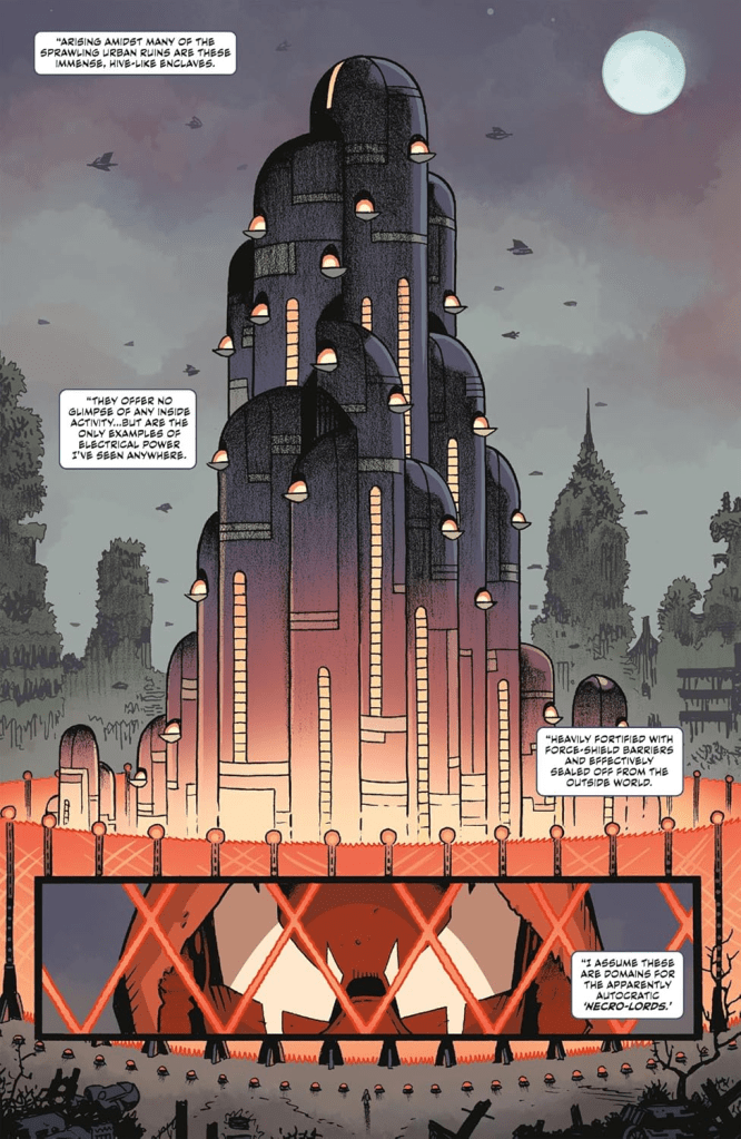 Matt Wagner es un narrador fantástico y un creador de imágenes super potentes. Hay pocos combates, pero cuando Grendel Prime tiene que defenderse, lo hace con una ferocidad y una potencia alucinantes. A esto hay que sumarle un diseño de personajes acojonante, que hace que todo mole mil. Grendel puede ser el diseño más sencillo y super icónico de la historia del comic, con sus ojos blanco y sus líneas verticales blancas a modo de cicatrices. Ver las variaciones de Grendels de este mundo desolado sirven para ver imágenes super guapas. Al igual que ver a los diferentes vampiros muestres seres terribles que simplemente con verles sabes que son malvados y merecen la muerte. Otro elemento que me gusta de este comic es que es una narración para adultos que no se esconde a la hora de mostrar a hombres, mujeres y monstruos desnudos sin pudor alguno. Tampoco a la hora de plantear combates super sangrientos.