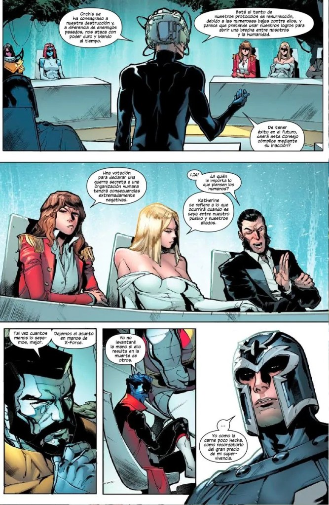 Tenemos a dos mutantes, Destino y Mística, que han conspirado para matar a otra mutante, la han torturado y la han despojado de sus poderes mutantes. Tres si sumamos a Emma Frost que es la conspiradora necesaria que les da las herramientas y la información para llevarlo a cabo. Tras cometer estos delitos gravísimos, ¿no son castigadas, sus actos no tienen consecuencias? Es terriblemente ridículo, y resalta lo que comentaba del engranaje, que lo importante es llegar al final buscado de quitar a Moira de la ecuación, el cómo hacerlo parece que carece de importancia. Porque lo mínimo debería ser que fueran expulsadas del Consejo Mutante, y lo normal que fueran encarceladas al lado de Dientes de Sable una temporada. Y nada de esto va a suceder, claro.