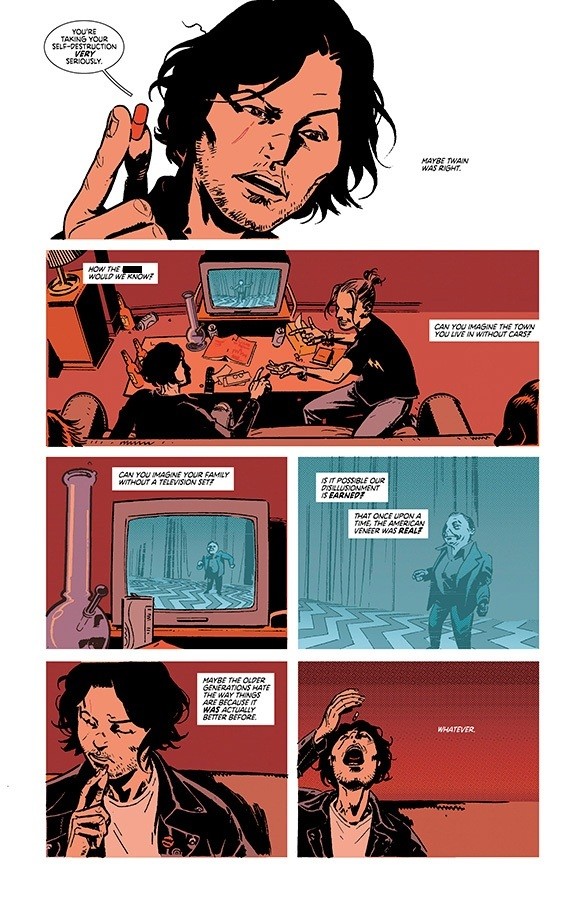 En otros volúmenes ya comenté que Remender estaba usando Deadly Class para exorcisar algunos de sus demonios internos y su negatividad patológica. En este sentido, la parte de Marcus mientras intenta ser escritor, asistiendo a jornadas de firmas en las que no tiene a nadie que quiera que le firme su libro, o luego cuando se siente un vendido al trabajar para el cine tras vender una de sus historias, creo que son cosas que salen de lo más profundo de su vida y cómo incluso ahora sigue teniendo el síndrome del impostor.