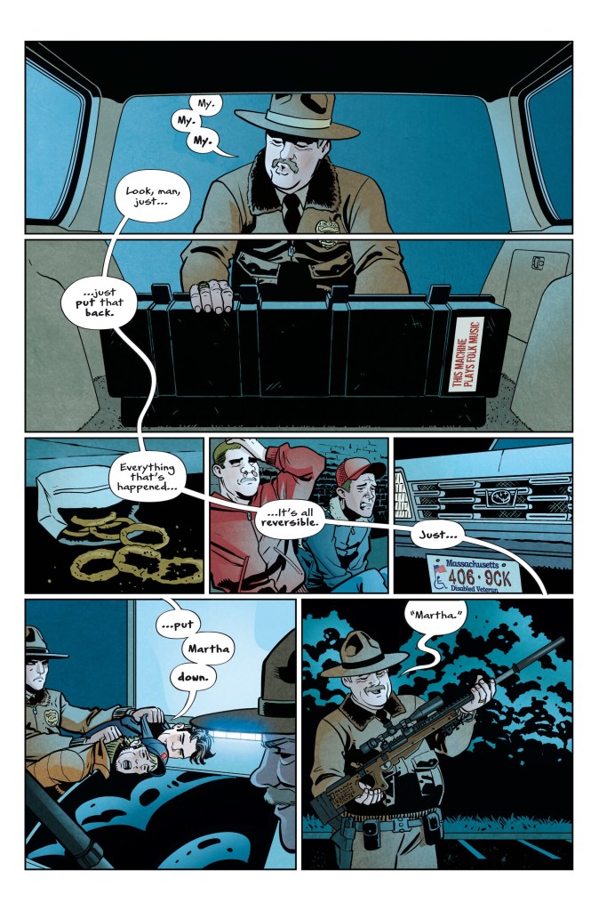Es complicado hablar de este comic sin entrar en spoilers teniendo en cuenta que yo compro la edición americana de un comic que de momento sigo inédito en España. Sin embargo, intentando mantener esta reseña libre de spoilers, creo que Cates es un guionista muy hábil que sabía cuando dar un golpe encima de la mesa para provocara un cambio de status-quo. Y este cambio le viene muy bien al comic, ya que este viaje a México nos muestra que este universo sobrenatural es mucho mayor de lo que nos pensábamos cuando todo pasaba en Texas, descubriendo toda una mitología de seres sobrenaturales malrolleros que darán mucho juego en los próximos tomos. Además de ahondar en las relaciones de los miembros de la familia Bowman que siguen con vida.