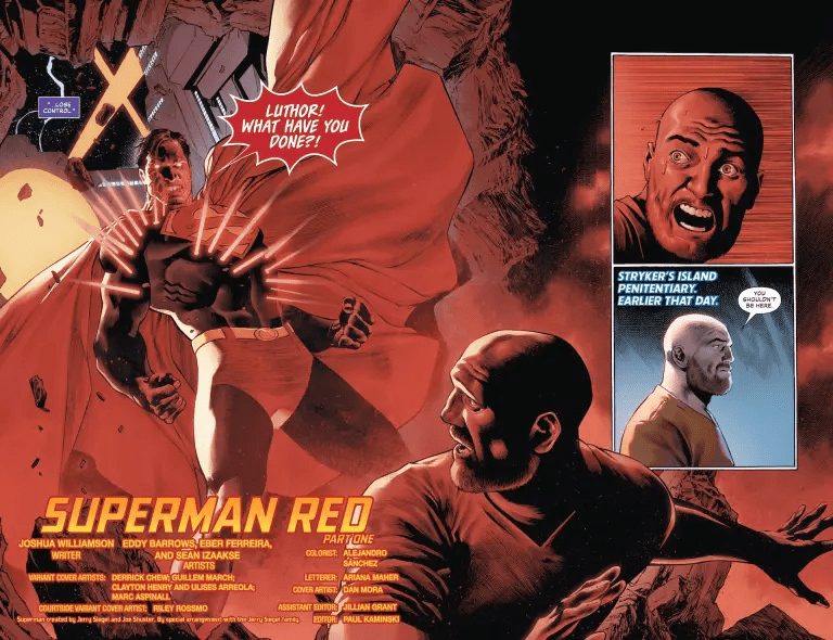 Me reenganché a Superman aprovechando el especial DC All In en el número 19 de la actual etapa escrita por Joshua Williamson. Eso significa que aunque este comic ofrecía un estupendo punto de entrada, en realidad estábamos en medio de numerosas tramas, algunas de las cuales se van a cerrar en este arco de dos números Superman Red. Empezando con el envenenamiento que sufre Superman de una extraña Kriptonita Roja que actúa cuando Superman se enfada. Encontrarnos a un Lex Luthor amnésico deseoso de ayudar a Superman con una LexCorp. convertida en SuperCorp. era otra clave de estos números a lo que hay que sumar el ver a Lois convertida en Superwoman compartiendo aventuras con su marido.