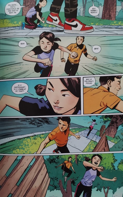 Igual el primer elemento a destacar es que Fire Power es un comic 100% para todas las edades. Samnee y Kirkman comentan en los extras de este volumen que una historia de artes marciales luchando contra un dragón y con el poder de lanzar bolas de fuego (y otros poderes que veremos en este tomo) podría haberse convertido en un comic gore con escenas de carne derritiéndose por el fuego lanzado contra ella. Sin embargo, fruto de la colaboración entre ambos, consiguieron crear un equilibrio con escenas de acción super espectaculares que puedan ser disfrutadas por lectores de todas las edades. Esto es algo que me encanta.