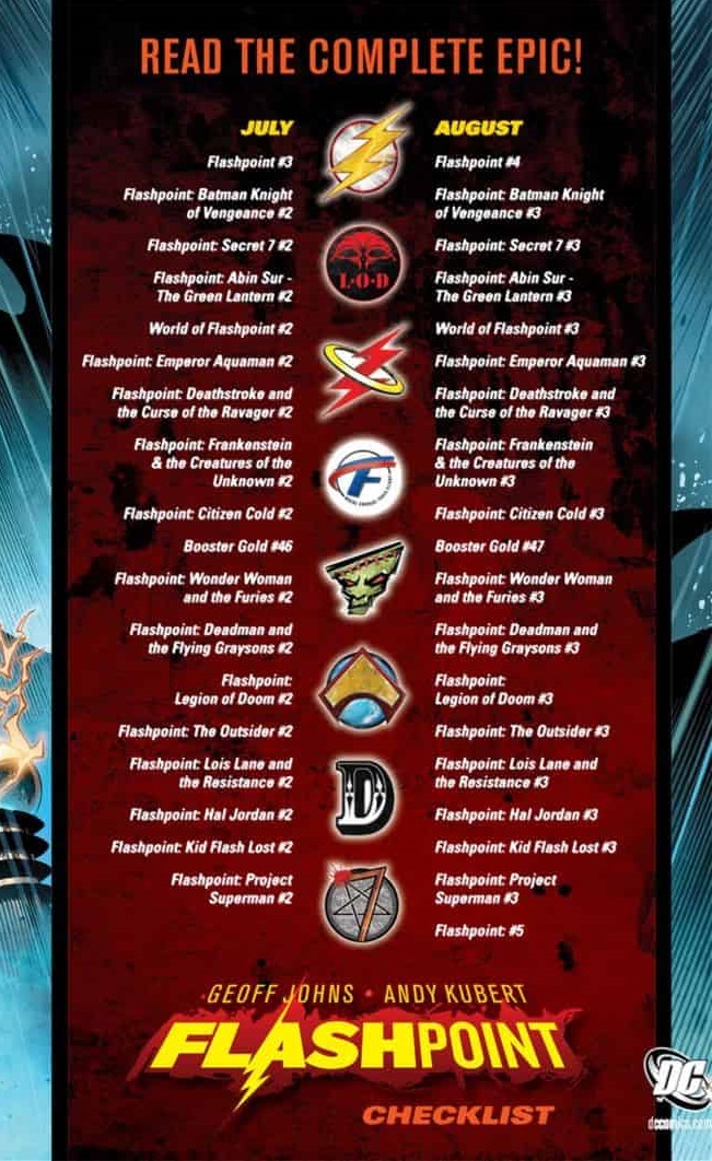 Flashpoint fue una miniserie de cinco números publicada en 2011 que resulta autocontenida y satisfactoria en si misma que tiene a Barry Allen de protagonista. Pero también se trata de un evento a lo largo de toda la línea editorial de DC Comics que contó con 17 miniseries de tres números y varios especiales destinados a ampliar la escala de este mundo reiniciado, descubriendo como les ha cambiado la vida a los principales personajes de la editorial.