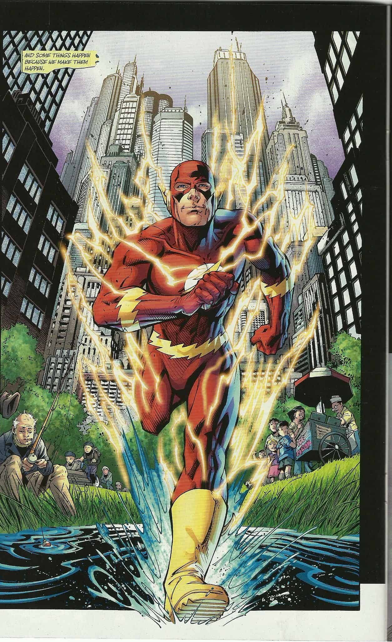 Más que Barry, que es un héroe puro que busca deshacer el problema que no recuerda haber causado, el gran personaje de Flashpoint es Thomas Wayne. Su diferencia como Batman respecto a la versión tradicional de Bruce, y como está dispuesto a arriesgarlo todo con tal que su hijo vuelva a la vida, incluso cuando esto significará que él va a desaparecer, es probablemente lo mejor del comic. Flashpoint muestra la habilidad de Johns como escritor, ya que pasan un montón de cosas en cada grapa a lo largo de una historia repleta de sorpresas impactantes, normalmente mientras descubrimos lo que le ha pasado a los héroes de DC, dejándonos además con unos cliffhangers espectaculares al final de cada grapa. Sin tener en cuenta lo que vino después, la verdad es que Flashpoint es un comic super entretenido.