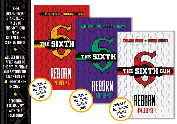 Oni Press ha lanzado junto a Cullen Bunn y Brian Hurtt un kickstarter para publicar The Sixth Gun Deluxe Omnibus, 4 tomos con todos los comics de la serie y las miniseries asociadas. Dentro de las recompensas de la campaña se incluyen tres nuevos números preludio que conducirán a la serie Sixth Gun Reborn en 2025 de los creadores originales Bunn y Hurtt.