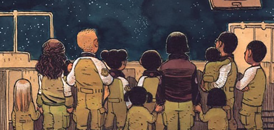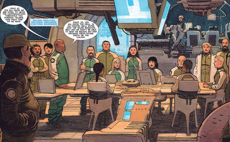 Hay que reconocer que el gran atractivo de este comic es el espectacular apartado artístico de Gabriel Hernández Walta, que en esta obra hace funciones de autor completo encargándose de lápices, tintas y colores. Y la verdad es que el resultado no puede ser mejor. Hernández Walta crea un ecosistema dentro de la nave que luce totalmente realista y que me hizo creer que este tipo de naves podrían existir en un futuro. Los niños y los adultos se sienten también personas reales con diferentes complexiones y figuras, lo que hace que todo el drama posterior consiga impactar. Además, opta por una paleta de tonos apagados de marrones y grises que me transmitió el sentimiento depresivo y dramático que estoy seguro que los autores buscaban, con una historia que además se desarrolla con un ritmo pausado, sólo interrumpido con varios destellos de intensidad y dramatismo. Globalmente, Hernández brilla a gran altura confirma una vez más lo buen narrador que es y cómo es un artista todo terreno.