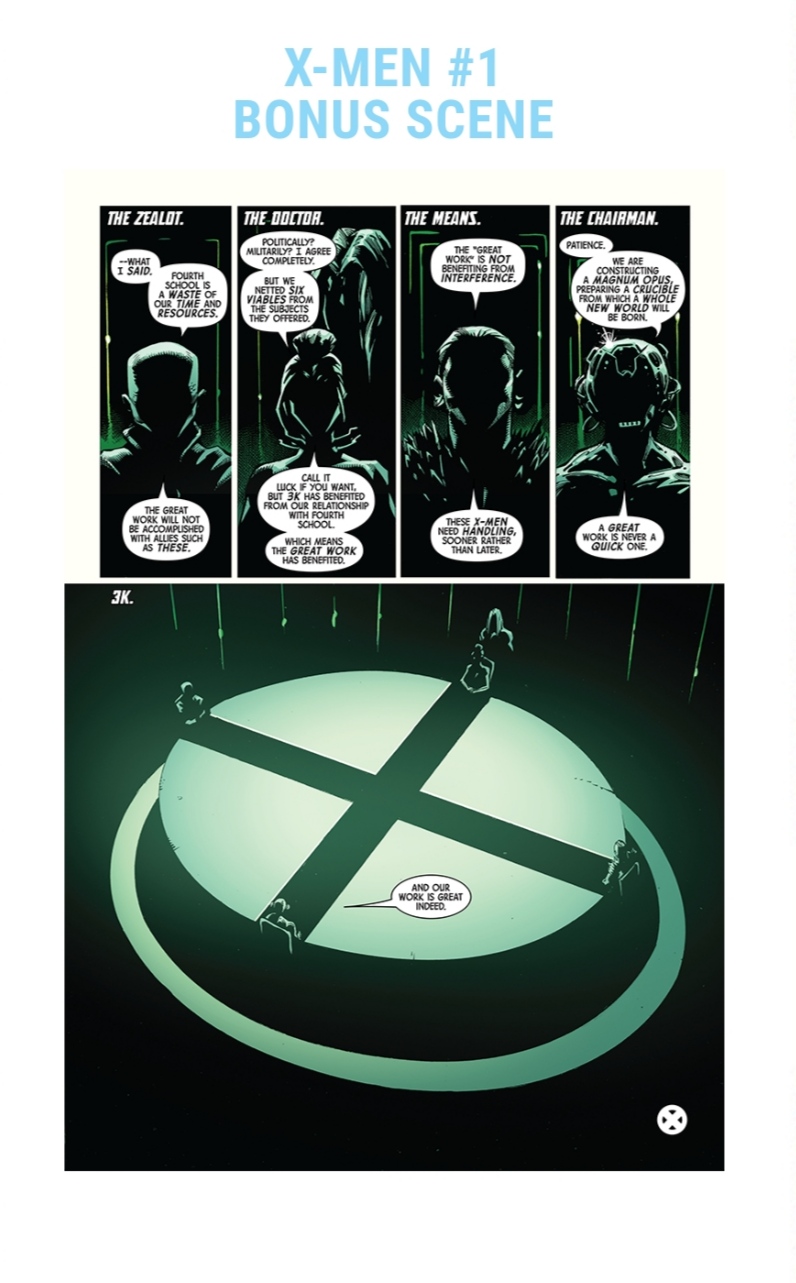 Una de las cosas que no he entendido es que tras el teórico final del comic se incluye un página con un QR ocupando todo el espacio que te lleva a la web de Marvel para mostrar una teórica página extra, que he añadido arriba para que la veáis. Pero es una página que debería haberse incluido en el comic, al mostrar en la sombra al grupo de villanos que está manejando los hilos y se supone serán los grandes enemigos de esta primera tanda de historias de los X-Men. Y esta decisión es incomprensible porque a) A la hora de leer un comic no todo el mundo puede tener su móvil cerca ni tienen por qué tener lector de QRS o conexión a internet. Y más importante b) Dentro de 5 años, ¿seguirá existiendo esta página web?¿O se perderá esta página en el futuro? Me parece tremendo que estén «birlando» a los lectores esta página pensando en los precios nada económicos de las grapas. Esto ha sido una ocurrencia pésima que me asombra que nadie en Marvel haya caído que es una mala idea. Y me parece un borrón un poco feo, aunque no es algo que empañe gravemente el comic.