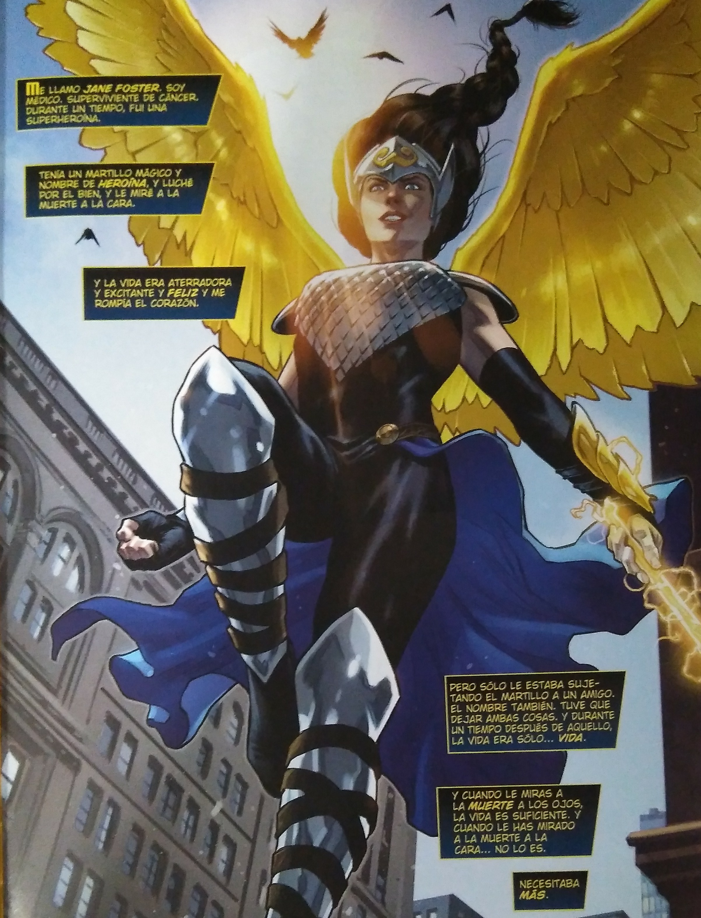 Ser Valquiria aleja a Jane de los mortales y los asgardianos, al tener la misión de acompañar a los héroes caídos tras su muerte. Esta nueva función entiendo que puede permitir a los guionistas crear historias muy diferentes a lo que estamos acostumbrados y es la primera obligación de un comic, ofrecer un entretenimiento que no parezca una fotocopia de decenas de historias previas.