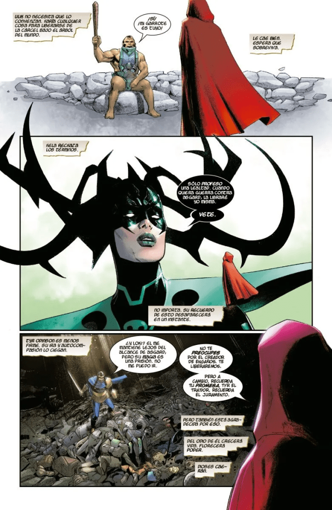 Además del interés de ver a Jane empuñar a Mjolnir, la miniserie vuelve a utilizar a Rüna, la nueva Vaquiria del Universo Marvel aparecida por primera vez en el evento Rey de Negro, que es la versión comiquera del personaje interpretado por Tessa Thompson en las películas del MCU. También destaca el uso de personajes poco habituales en el mundo de Thor como es el demonio del limbo S´ym (de infausto recuerdo para Illyana Rasputin en su miniserie de origen que años más tarde cobró todo el protagonismo gracias a Inferno), además de otros más habituales como la Encantadora, Tyr, el elfo oscuro Algrim o Ulik el troll. Aparte de la sorpresa de los villanos detrás de toda esta guerra, que prefiero no spoilear para los que no hayáis leído el comic. En general, Grønbekk transmite que tiene un gran conocimiento de la historia de Thor, y en general del universo Marvel, dado el uso que hace de algunos personajes poco conocidos en esta historia.