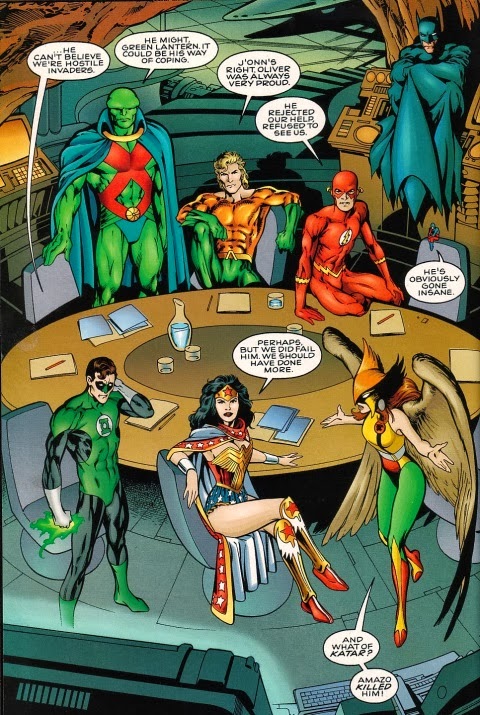 Sin Superman, la Liga de la Justicia de América está formada por Batman, Wonder Woman, Green Lantern, Flash, Hawkwoman, Atom, Aquaman y el Detective Marciano, Y aunque esta es sin duda una historia de la Liga, por estas páginas pasarán prácticamente todos los héroes de DC Comics: los green Lantern Corps, los Metal Men, la Doom Patrol, los Outsiders, Robin o Catwoman, así como villanos como Joker, Amazo, Ra´s Al Ghul o Lex Luthor. Estamos sin duda ante un “quién es quién” del Universo DC, y a pesar de la gran cantidad de personajes y situaciones, incluso un lector no habitual de DC puede disfrutar completamente de la historia.
