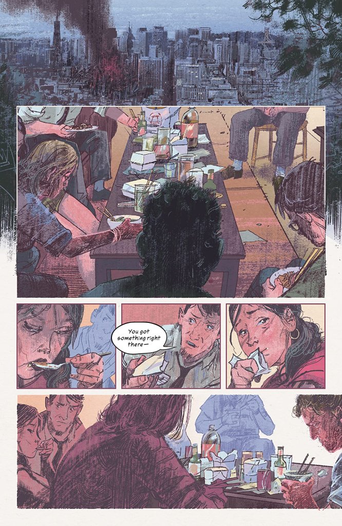 El dibujo de Joe Infurnari en este volumen cuenta con color de Gonzalo Duarte. Y globalmente mantiene los pros pero sobre todo los contras que he encontrado en volúmenes anteriores, que sobre todo se podrían resumir en que hace farragosa e incómoda la lectura. A la falta absoluta de fondos y una elección cromática que convierte el comic en más gris que lo que ya es la historia, hay que sumar un cuestionable trabajo a la hora de dibujar a los protagonistas, de forma que varios de ellos se confunden constantemente durante la lectura. De hecho, en la historia encontrados que DOS personas han viajado al pasado (nuestro presente) y en muchos momentos es imposible saber si estamos viendo al yo joven o el adulto.