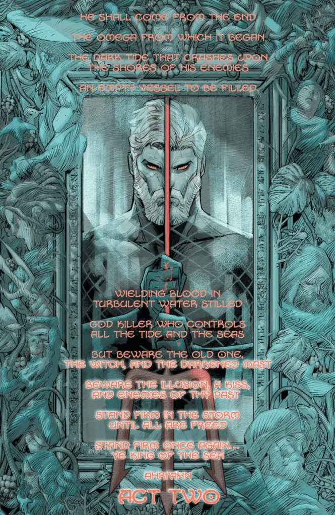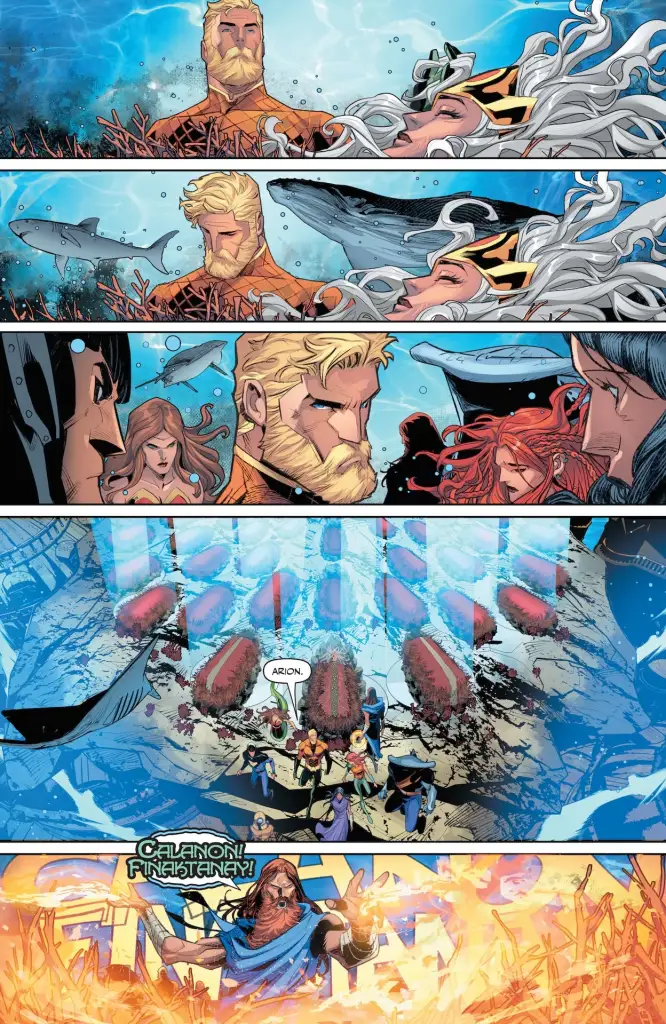 En el primer arco de la nueva etapa de Aquaman de Jeremy Adams los poderes de Arthur Curry han aumentado exponencialmente, al convertirse en el avatar del Blue, prácticamente un Dios. Y tras su aventura por otras dimensiones, toca volver a nuestra realidad con su nuevo grupo de héroes marinos, entre los que encontramos a Arion, al Capitán Nemo, a la Dama del Lago y sobre todo, a su crecida hija Andrina, que posee la fuerza y ferocidad de su fallecida madre Mera.