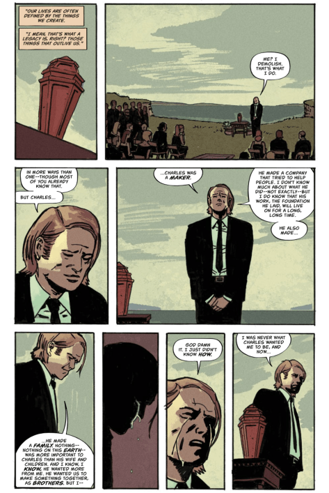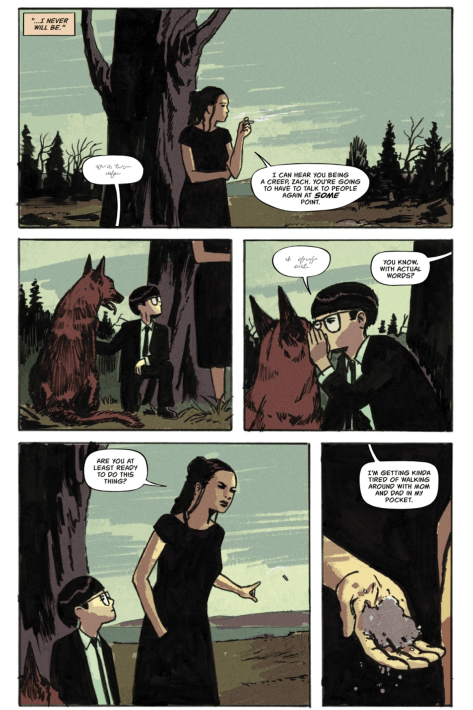 Por otro lado, el enorme cambio de status-quo que veremos en el segundo volumen, «Ascender», que se publicará en 2019, me hizo pensar sobre la relación entre escritor y artista, y como mantener la chispa creativa de ambos. Se me hace muy raro pensar que cuando Lemire planteó esta serie pensara en este cambio tan bestia, aunque la historia es lógica en todo momento. Sin embargo, sí me cuadra más que Nguyen tras varios años trabajando en lo mismo le pidiera desafíos nuevos para mantener su chispa creativa y no «aburrirse», y Lemire preparó este cambio para tenerle contento. Lo cual, si fuera así, tampoco tiene nada de malo, por supuesto. De hecho, yo como lector también agradezco que Lemire ofrezca nuevos desafíos para que Nguyen se luzca con su bello y carismático estilo pintado.