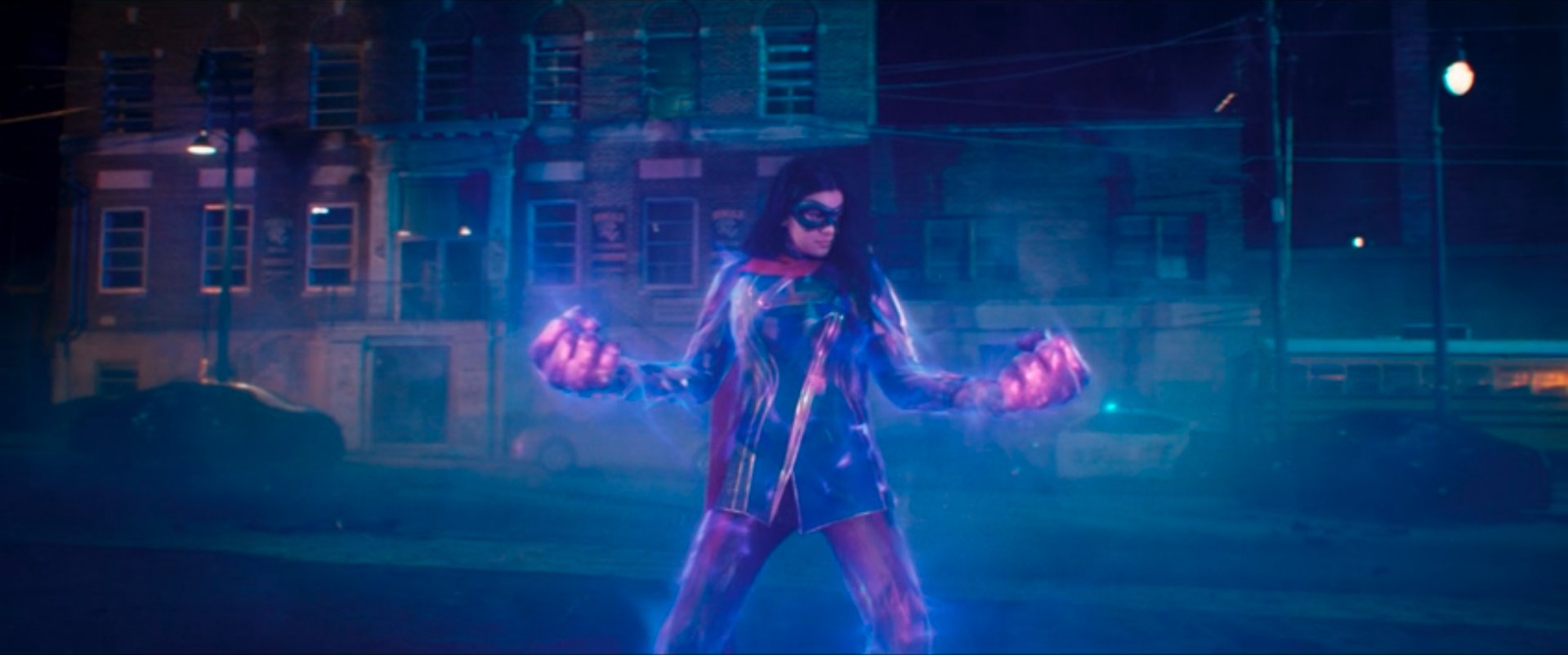 La serie ha sido tremendamente obvia en su estructura de historia de origen típica contada en orden cronológico, dejando para este último episodio ver a Kamala con su traje de superheroina 100% finalizado. Y la verdad es que la espera merece la pena, porque el traje de Ms. Marvel luce de maravilla en pantalla y lo considero otro de los grandes aciertos de la serie. En la reciente Caballero Luna ya comenté que Marvel no había acertado con el traje de Marc Spector y eso era un problema importante, pero no es el caso para nada con Ms. Marvel. Vellani luce genial con él puesto y nos da los momentos comiqueros que llevábamos esperando desde el comienzo de la serie (con una importante salvedad que luego comentaré).