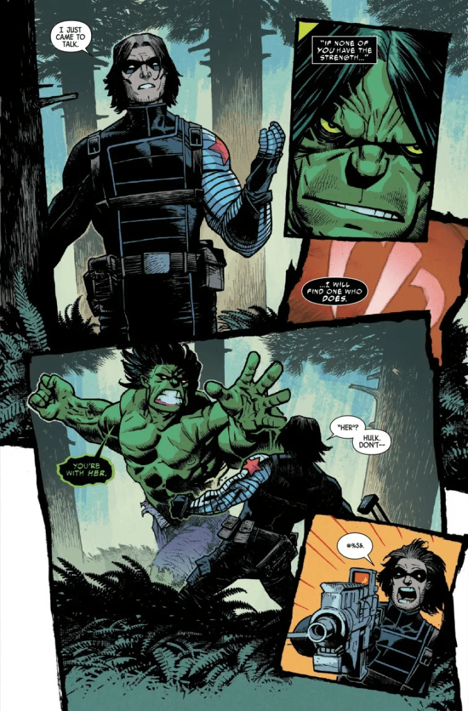 Estas dos grapas cuentan sendas historias autoconclusivas. En la primera Bucky Barnes busca a Hulk / Banner para avisarle que alguien está secuestrando a seres mutados Gamma. Además, avisa a Charlie, la amiga de Hulk que le acompaña desde el comienzo de esta etapa, que Hulk sin Banner es peligroso y que lo mejor que puede hacer es marcharse en cuanto vea algo que no le guste, o que rompa la ilusión que tiene que Hulk está intentando ser un «héroe».