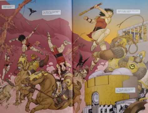 Pero además, como escritor Rodríguez nos ofrece un comic que cuesta de leer (en el buen sentido), con unas páginas en las que cada viñeta es un descubrimiento, no sólo en lo referido al dibujo, que ya comentaba es espectacular, sino con la compleja historia y los múltiples personajes que riegan los personajes. Además, dentro que entiendo que este comics es «All-ages» (aunque no estoy seguro), o como mucho (PG-13), no se arruga a la hora de matar de forma violenta a muchos personajes.