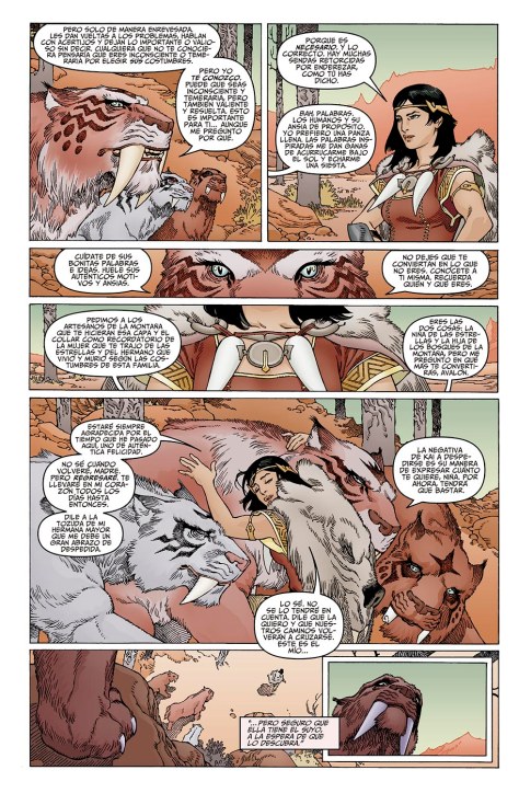 Por otro lado, la lectura de este volumen también me dió la sensación que Rodríguez confía quizá en exceso en los conocimientos de los mitos artúricos por parte de los lectores. A partir de una rápida presentación de Avalón y cómo fue criada por los dientes de sable (que mostraré al final del artículo en el preview), la historia nos mete de lleno en un mundo con una compleja sociedad de clanes enfrentados y religiones antagónicas, con cero presentación de cada uno de los actores de este comic. Es cierto que Rodríguez crea una lectura rápida que te mete de lleno en la historia, pero debo reconocer que eché de menos un poco más información, sobre todo en lo referente a los antagonistas, que se me quedan muy cortos en casi todo. No en lo relativo a su nivel de poder y sensación de amenaza, pero completamente en lo relativo a sus motivaciones y en la explicación de cómo llegaron a este mundo.
