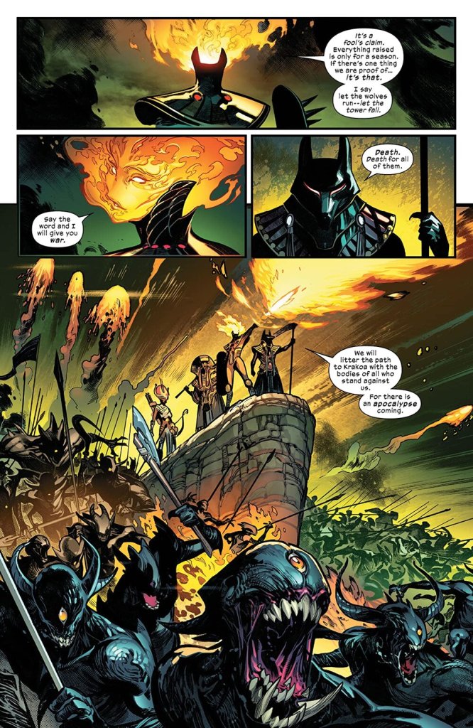 Este número está lleno de momentazos, sorpresas y alguna traición, y gracias a Pepe Larraz en el dibujo con color de Marte Gracia, las páginas tienen una fuerza alucinante, además de disfrutar de un estupendo diseño de los personajes de Arakko que teniendo reminiscenciaas egípcias, son diferentes a los típicos villanos de marvel. De hecho, no hay nada de tópico en el argumento de Hickman, y gracias a Larraz, el comic es puro carisma y personalidad.