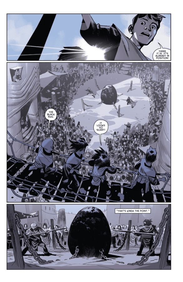 Lo primero que quiero destacar en Void Rivals es la cantidad de personajes que están viviendo sus propias aventuras y que en algún momento van a ir encontrándose, como hemos visto en estos números. Por supuesto están los protagonistas Darak de Agorria, que ha vuelto a su pueblo para enfrentarse a su padre, el ministro Dulin que se opone a cualquier intento de unión con sus vecinos de Agorria. Luego está Solila de Zertonia, que al final del volumen anterior se dirigió hacia el centro del anillo para encontrar las respuestas que necesita sobre el origen del anillo y el papel que juegan Agorria y Zertonia.