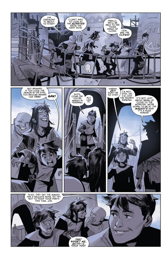 Lo primero que quiero destacar en Void Rivals es la cantidad de personajes que están viviendo sus propias aventuras y que en algún momento van a ir encontrándose, como hemos visto en estos números. Por supuesto están los protagonistas Darak de Agorria, que ha vuelto a su pueblo para enfrentarse a su padre, el ministro Dulin que se opone a cualquier intento de unión con sus vecinos de Agorria. Luego está Solila de Zertonia, que al final del volumen anterior se dirigió hacia el centro del anillo para encontrar las respuestas que necesita sobre el origen del anillo y el papel que juegan Agorria y Zertonia.
