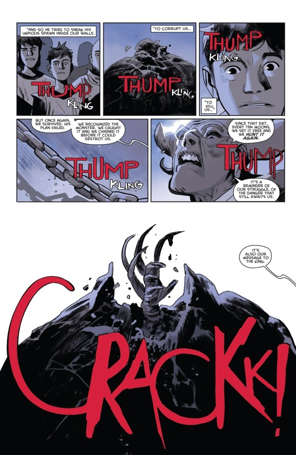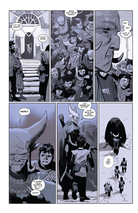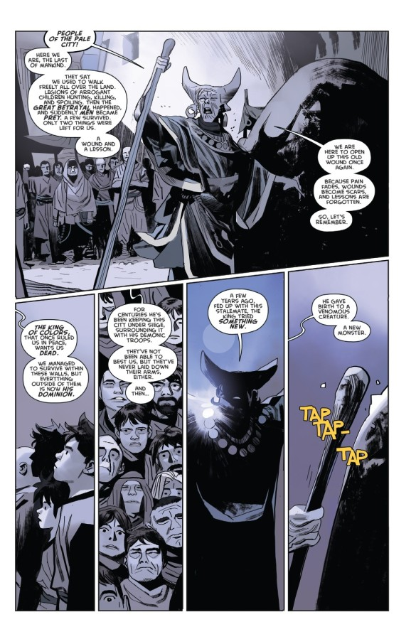 En la parte del dibujo hemos tenido una de cal y otra de arena. Lo positivo es que Lorenzo De Felici, acompañado por Patricio Delpeche en el color, es espectacular. De Felici es un artista que me encanta desde su descubrimiento en Oblivion Song, y ha creado toda la personalidad gráfica de este mundo, lleno de personajes memorables y reconocibles empezando por los protagonistas Darak y Solila. De Felici tiene un estilo centrado en la narrativa y en contar la historia de la forma más clara posible, y consigue que la lectura de este comic sea un placer.