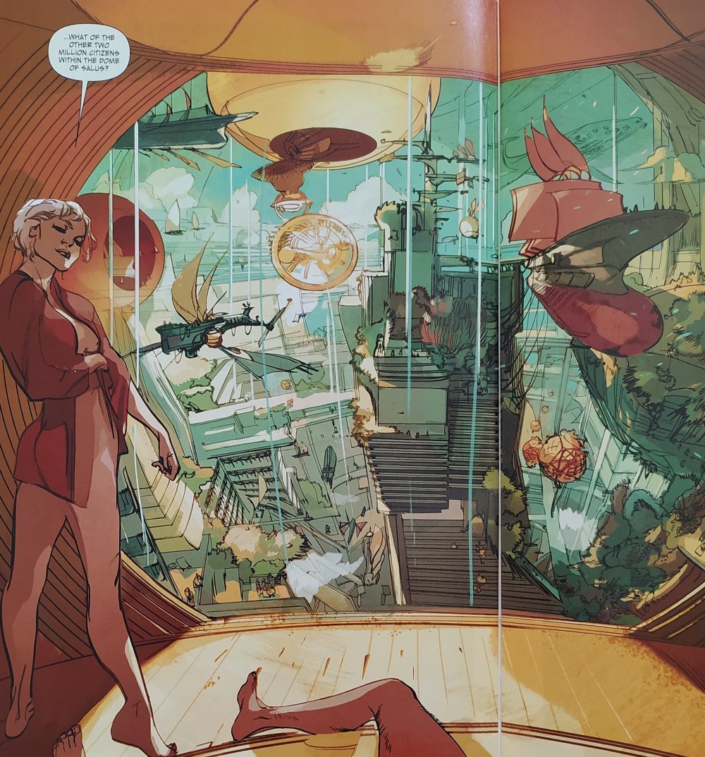 La sensación de «apelotamiento» que comentada antes es una parte culpa de Remender, que mete demasiadas cosas en cada página para terminar la historia, pero también debido al déficit como narrador de Tocchini. Esto hace que la sensación de confusión esté presente en varios momentos del climax final, de forma que aunque me parece que LOW es un buen comic con un buen final, se me queda muy lejos de mis favoritos como Fear Agent o Black Science.