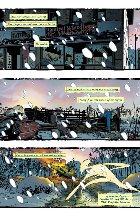 Aunque dicho eso, algunas respuestas aparecen de repente, como la identidad del asesino de Em, y una idea en concreto es una autentica locura. Aún no he decidido si esto es bueno o malo, y esa duda ya indica que creo que algunas decisiones no acabaron de cuadrar. En este sentido, hay personajes como la General Cale o la ninja Amish que tienen gran importancia en el final y que prácticamente fueron presentados en el tomo anterior, lo que es una pequeña trampa teniendo en cuenta la cantidad de personajes con los que han contado desde el principio que han acabado infrautilizados. En todo caso, esto es un pequeño pero, porque la conclusión de la historia ha tocado todas las teclas emocionales correctas para hacer que el final sea totalmente satisfactorio.