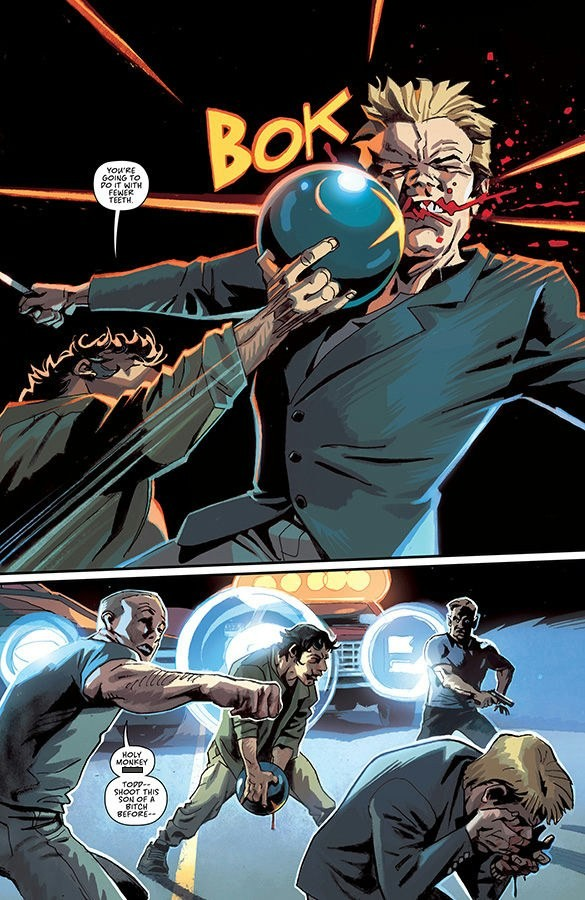 El comic tiene unas grandísimas dotes de humor negro y un argumento loquísimo una vez descubrimos el plan maestro de los neo-nazis. Entiendo que esta locura ridícula es debida a la colaboración de Remender con Andy Samberg (Saturday Night Live, Palm Springs) y el cantante de Fall Out Boy Joe Trohan. Cuando tenemos una farsa de este calibre, es un placer ver machacar a nazis con bolas de bolos. O la obvia conexión entre el plan del villano y la historia de Donald Trump como magnate inmobiliario. Pero dentro de la farsa, me ha gustado mucho varios detalles de la historia. Empezando con la caracterización de Levi Coen como un joven que busca huir de su herencia judía y de la afición por los bolos de su padre. En estos momentos en los que en el entretenimiento se propone y de promociona la cultura de tribu en lo que lo importante no es la persona sino el grupo identitario al que pertenece el protagonista, resulta muy chulo leer un comic en el que el protagonista es todo lo contrario.