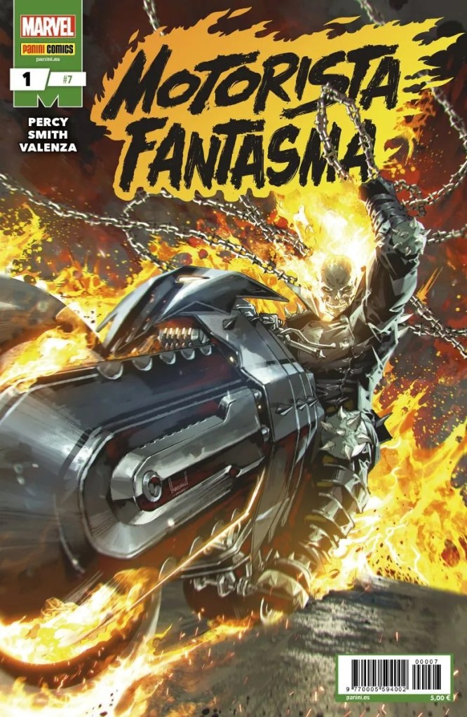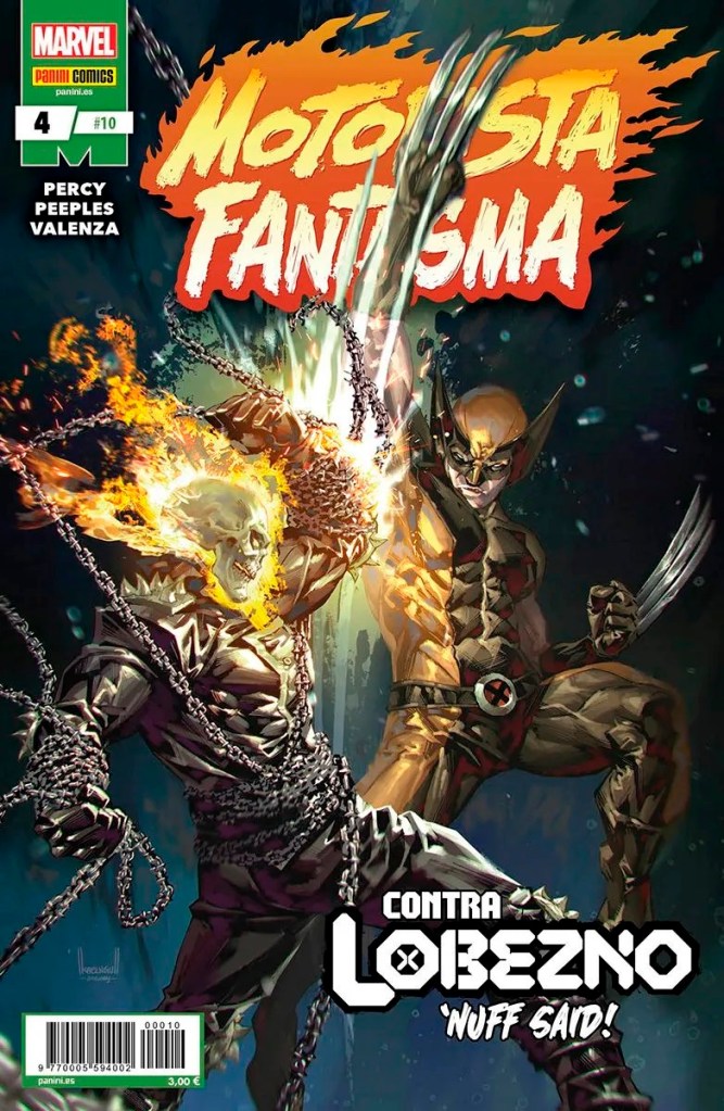 Dejé la colección de Lobezno hace unos meses porque dejé de conectar con el over-the-top que planteaba Benjamin Percy en cada grapa. Sin embargo, creo que está realizando una buena labor en la serie regular de Motorista Fantasma, comic que Panini está publicando bi-mensualmente. Cuando Panini anunció este cruce, la verdad es que de inicio no me motivó demasiado, al ser algo que nos devolvía a lo peor de los años 90 en que estos personajes y Punisher multiplicaron su aparición por todo el universo Marvel. Sin embargo, a medida que pensaba en este comic, más ganas tenía de ver la macarrada que Percy podría plantear para la reunión de estos anti-héroes.