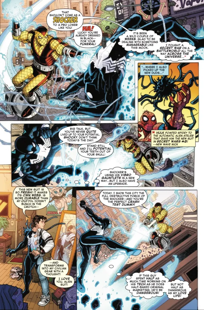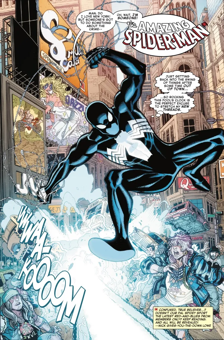 Otro detalle muy guay del guion es que además de la ambientación ochentera, Kelly incorpora un detalle clave sobre los simbiontes que se conoció años más tarde mediante el uso de la retrocontinuidad, de forma que enlace con cosas que hemos leído hace pocos años atrás. La idea de que Peter llevaba un simbionte resulta clave en la historia de Kelly. Y nos da el WTF?! más loco y alucinante de los últimos años. Algo ridiculamente loco que no debería funcionar pero lo hace, y me ha dado un subidón alucinante. Pensando que estamos ante un comic de apenas 30 páginas en el que hay muy poco espacio para plantear nada, el triunfo argumental de Kelly me parece una pasada.