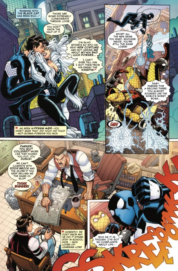 Joe Kelly acierta en todos los sentidos. Empezando por la forma en que entiende la premisa del comic ambientado en los años 80. En el Godzilla vs 4F ves la ambientación años 60 por el Fantasticar y algunos detalles del vestuario y peluquería. Sin embargo, esta misma historia sin cambiar nada podría situarse en los años 70, 80 o cuando se quisiera. Gerry Duggan se equivocó con la premisa de su Godzilla vs Hulk, planteando un What if? ambientado en los años 70 con montones de situaciones que no habían sucedido así en la continuidad de Marvel. Sin embargo, Kelly me ha volado la cabeza planteando su historia con montones de detalles de la época que como lector de esos comics me ha encantado. Empezando por situar la historia justo después de que Peter volviera de las Secret Wars con el traje negro simbionte o que se enfrente a Shocker al comienzo del comic. (Por cierto, siendo puntilloso, es posible que algunos elementos de este comic como que Mary Jane se pelee con Felicia Hardy (Gata Negra) por el corazón de Peter no sucedieran en realidad, porque la relación de Peter y Felicia sucedió en un momento concreto y luego Peter y MJ afianzaron su relación. Pero en el contexto de este comic, es un momentazo que funciona y es super divertido).